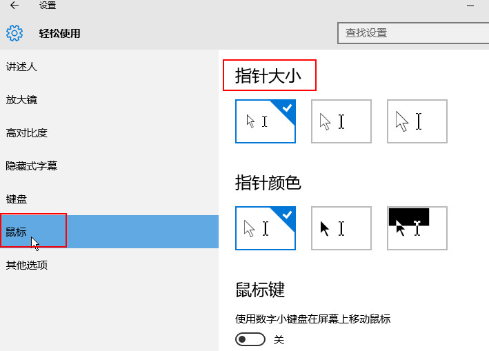 3、点击“鼠标”点击相应的框来选择,指针大小有小号、中号、大号,如下图所示: