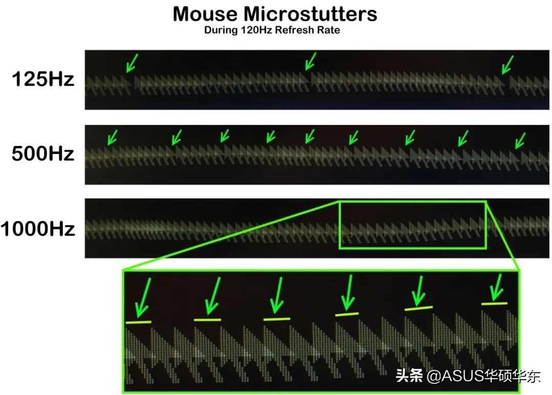 屏幕刷新率120Hz时,指针显示差别上500Hz和1000Hz差距已经很小,且可以预见2000Hz级回报率需要G-sync一类同步刷新率功能才能避免重影和伪影