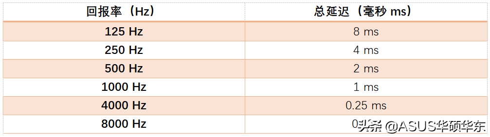 例如,回报率设置为125Hz的鼠标,每秒将刷新其在屏幕上的位置125次。回报率越高,你在屏幕上看到的光标移动就越 "实时"。下面是一个常见回报率下的总延迟表。