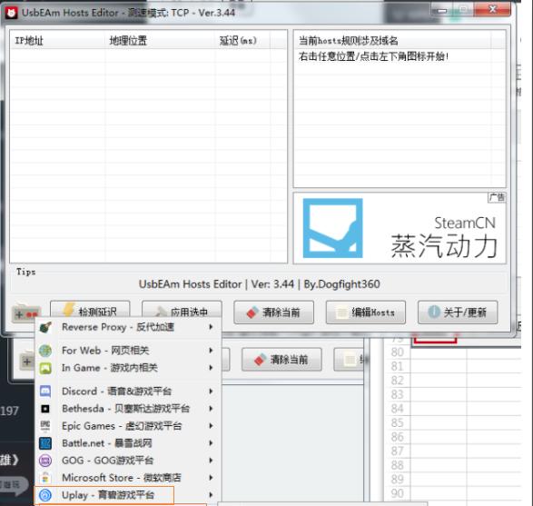 下载工具UsbEAm Hosts Editor并打开,点击UsbEAm Hosts Editor左下角的图标,点击【Uplay-育碧游戏平台】