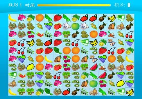 大家可以看到进入游戏页面的首先会看到上方有时间的进度条,这就意味着需要在这个时间段内达到过关所需的分值才可以,所以,当你已进入游戏一定要抢时间,先将中间所有同样的水果或蔬菜快速的进行消灭,再四周周边的同样的水果或蔬菜进行消除,在这样操作的同时也需要关注所有尽可能可以消除的其他类型水果或蔬菜,这样第一级别就很容易