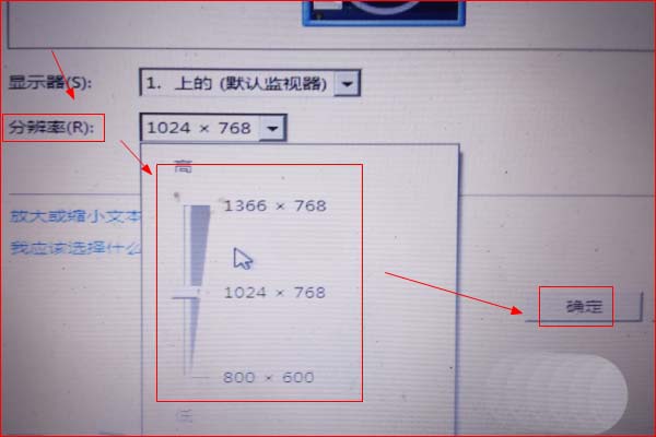 4、在打开的“屏幕分辨率”窗口中,点击“分辨率”右侧的倒三角符号,在弹出的页面中,拖动滑块至适合显示器的分辨率,然后点击“确定”。