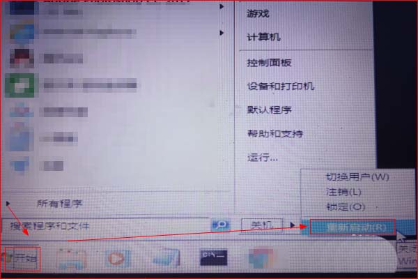 5、然后点击“开始”,在弹出的“开始”菜单中点击“关机”旁边的三角符号,在弹出的选择页面点击“重新启动”。
