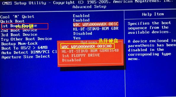 第一步:开机后,显示器左上角光标闪,无法进系统。首先把硬盘设置成第一启动项,看下图如何设置;