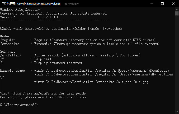 微软出品的免费数据恢复软件 Windows File Recovery,需要 Win10 2004 版本以上才可以使用,功能支持可根据关键词、文件路径、文件名称、扩展名恢复。支持 NTFS、FAT、exFAT、ReFS 文件系统。
