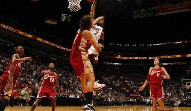 这是在2009年11月12日,热火对阵骑士的比赛中,当年正值运动员巅峰期的韦德做出了一个让TNT票选为当季第一的扣篮,这个球就是韦德隔扣身高2.10米的骑士中锋瓦莱乔,虽然瓦莱乔拼命防守还打到了韦德的脸颊,但他依然无法阻挡韦德这记石破天惊的隔扣,球不久进了,瓦莱乔还被撞飞出底线撞倒篮球架,这是什么爆发力和力量的结合?动态显示: