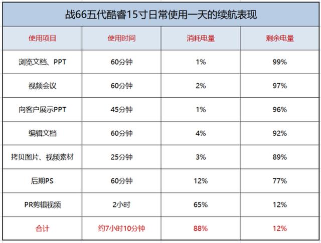 续航表现方面,战66五代酷睿版拥有更大的51WHr长寿命电池,这款电池能够为整机提供更长时间的续航,在续航表现方面,经过我们的实际测试,从早上上班开始进行一天的日常使用,最终耗电量为88%,剩余电量为12%,使用时间为7小时10分钟,基本能够满足一天的工作需要,对于轻度办公来讲,这款笔记本电脑完全能够满足10.5小时的续航要求,并且战66五代酷睿版还支持快充技术,半个小时就能将笔记本的电量提升到50%,让我们随时随地不断电运行,续航表现极为出色。