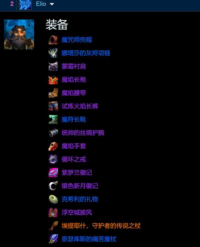 奥法位列三系法师之首,看看这个世界排名第二奥法的装备,除了魔焰套其他都是平民装,武器甚至还用着60级的橙杖。是不是感觉那些花了大价钱做法术打击套+暗纹冰霜套+毁灭束带一身毕业装却坚持玩冰法的玩家亏大了?