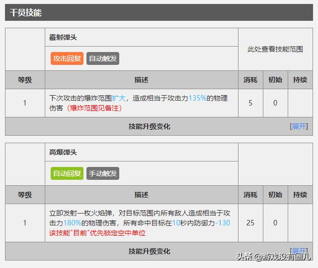 部署26费用,攻速慢。特性:普通攻击与技能释放时,30%几率当次攻击的攻击力+60%。【霰射弹头】:下次攻击的爆炸范围扩大,造成相当于攻击力135%-215%的物理伤害。【高爆弹头】:立即发射一枚火焰弹,对目标范围内所有敌人造成相当于攻击力180%-300%的物理伤害,所有命中目标在10秒内防御力减少130-330。