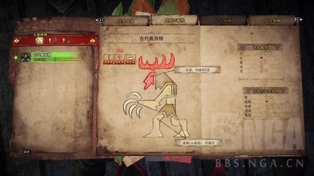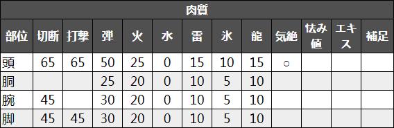 - 对于近战武器:肉质相当好,打任何部位都可以触发弱特(肉质45以上),但是因为弱点部位位于头部,打点比较低的武器会相对吃亏一点(双剑,操虫棍,大锤等),但也不是不能打;