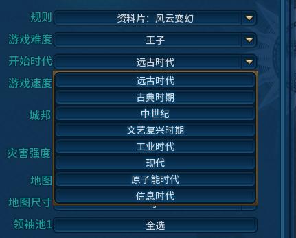 开始时代这个选项,可以帮助多数文明完成时间长河冲刷的挑战,把他们扔到一个合适的时代开始游戏。