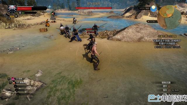 再一次恢复知觉时,自己正被一群士兵押送着前进,一同被关押的囚犯的脑袋已经被挂在了其中一个士兵的腰间。杰洛特激发求生意志,对士兵发动了奇袭,并且一举获得了自由身。这边战斗开始时,HP是很低的,而且没有装备上衣,手套和武器,可以从包裹里找出并装备。这边的战斗可以选择打,也可以直接逃跑,没有强制规定。