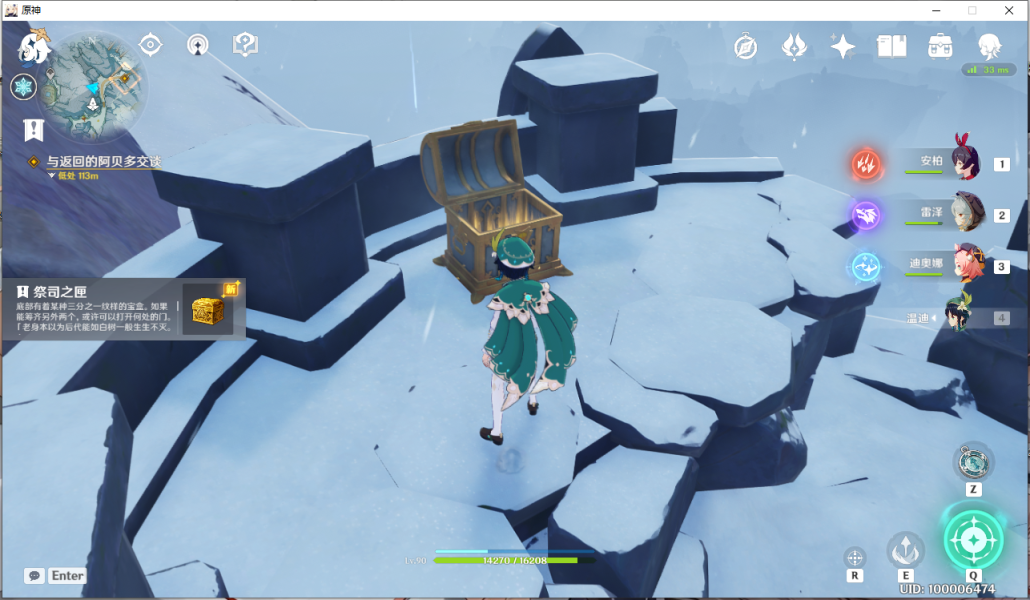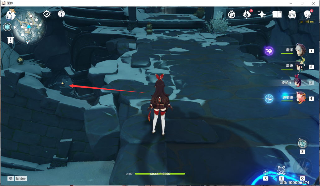 第6个石碑首先来到雪葬之都下方的传送点,往上方走到洞外平台,找到下图密室,使用前面得到的3个宝匣打开;