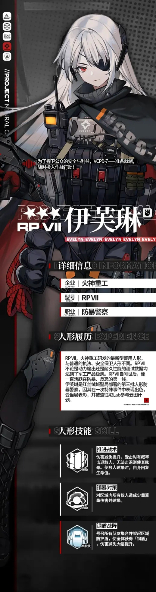 2、技能解析:伊芙琳的被动技能是推进战术,我们在战斗中伤害减免提升15%,受到贴身攻击的时候有概率可以击退敌人一格,并眩晕他,如果没有击退,就直接进行眩晕。主动技能眩晕镇暴,可以向敌人集中的区域投入镇暴弹,对这个区域的敌人造成30%算力的伤害,并眩晕敌人。大招是可以号召友方单位集合并架起护盾,使友方单位5秒内获得钢盾的保护,钢盾可以提供伤害减免30%,带来一定的效果增益。