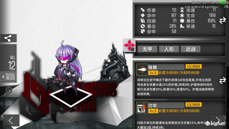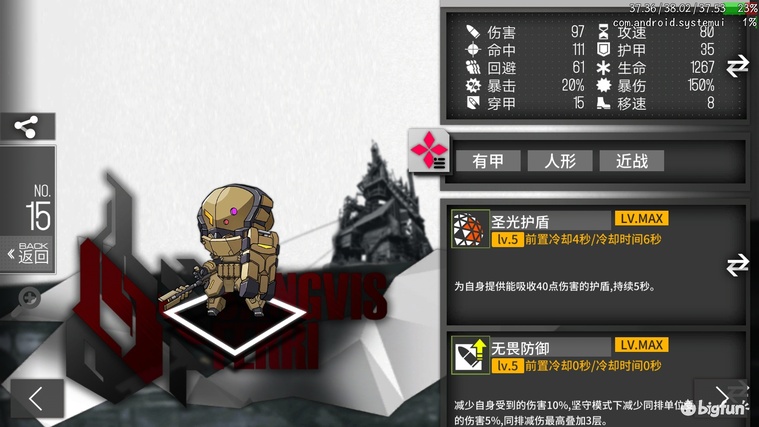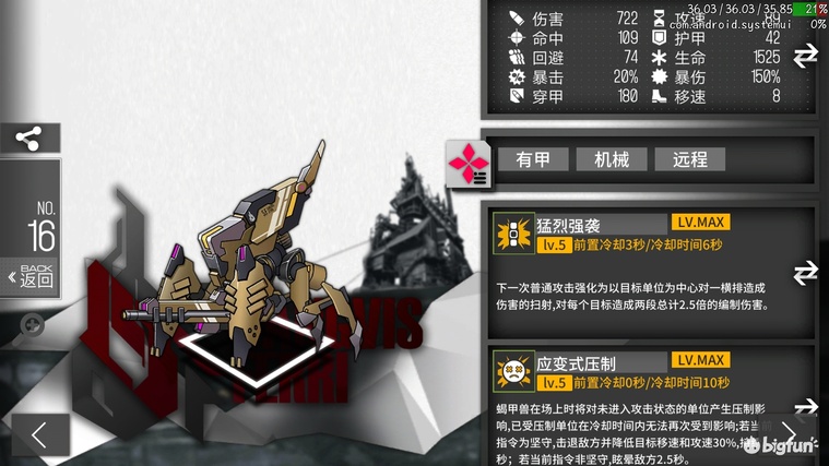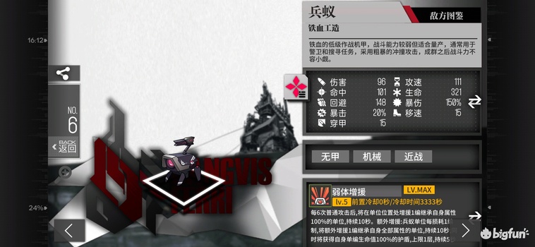 B级4费闪T或输出,高移速低穿甲低命中,788-1497dps或6199-12599等效血量。技能覆盖前20秒的50%,坚守时前20秒平均等效血量为9399,冲锋时前20秒平均dps为1143。技能特性相当尴尬,坚守输出时给的闪避buff,冲锋的时候给伤害buff,且没有穿甲所以输出基本是废的。拉枪工具人+1,自身等效血量极高,但拉枪时要确保坚守状态下触发技能有一定难度,而兵蚁算上增援和盾也有5715等效血量。作为拉枪工具人适用于所有场景,但是性价比远不如2费兵蚁,没有上场机会,全拆。