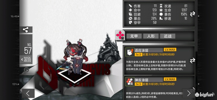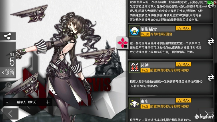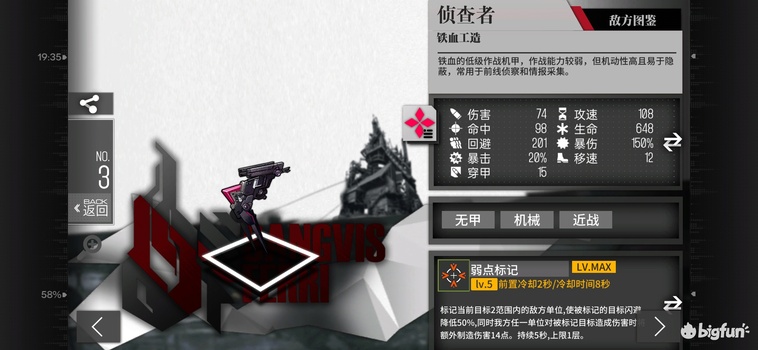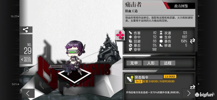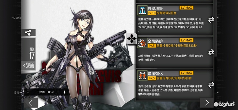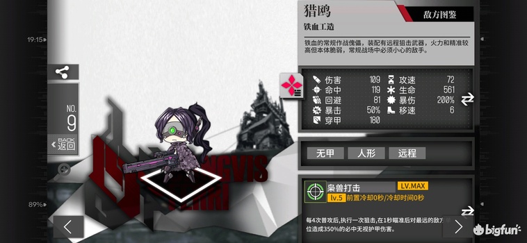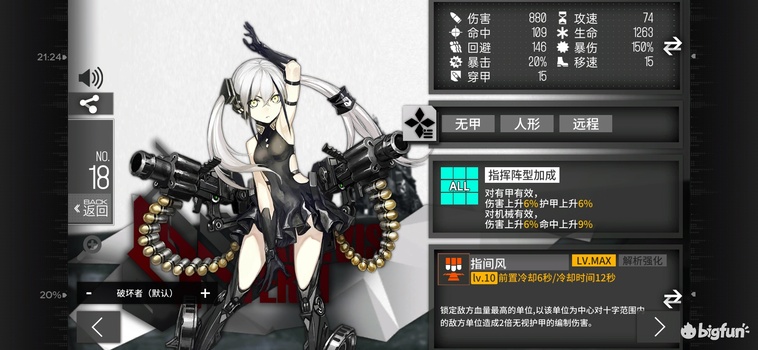 A级4费闪T+增益+输出,高闪避高移速低穿甲,940dps,4990等效血量。技能2范围区域增伤覆盖62%时间,对2组30闪目标可提升16.7%劫豹dps(技能期27%从1029到1304),提升26%机枪dps(技能期42%从682到971),提升8.7%猎欧dps(技能期14%从1043到1191),其他单位获得提升介于这两者之间。低命中高射速或者大量aoe的锁前排单位的专属挂件,致命缺陷在于范围太小而且只标记前排。局限性较强,自身无法打高甲,几乎只适配机枪,范围太小。适用于专门的机枪爆发队,泛用性一般,留一组xl不练备用即可。