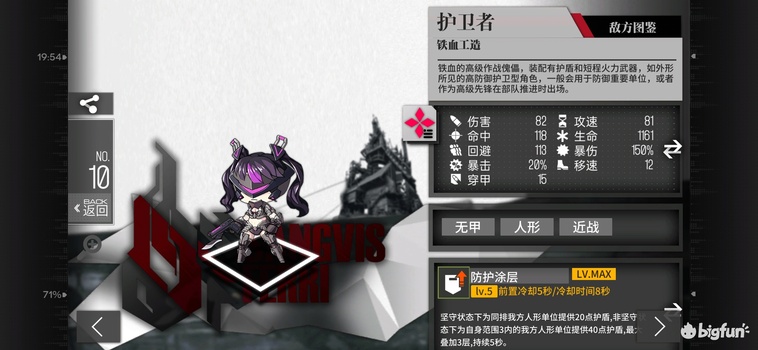 B级4费近战群体护盾闪T,5534等效血量,753dps。1技能护盾只给人形不给机械,覆盖60%时长,坚守下全体人形20点,否则3范围内人形40点,均低于p22和hs2000。EX护卫者的低费下位替代,除了费用,护盾厚度,覆盖,灵活性,肉度,移速等均不如EX护卫者。适用于所有人形梯队减损或抗aoe,除非有必须要4费贴膜否则不如直接上EX护卫者,留稀有体型,其余全拆。