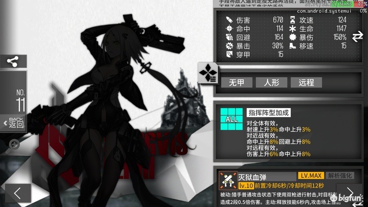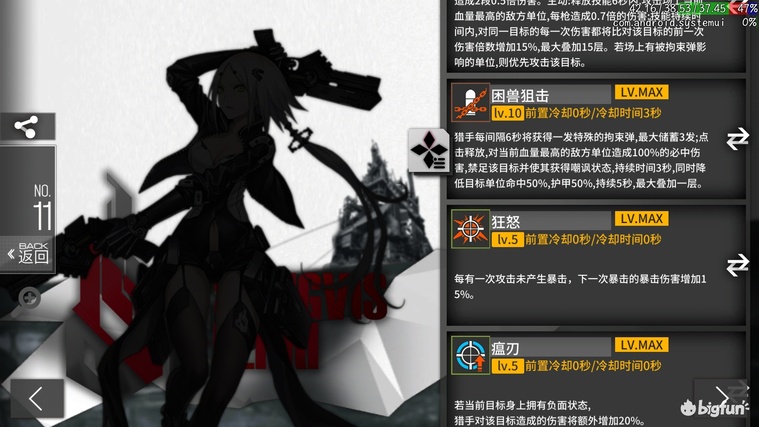 S级4费持续输出狙,高穿甲低移速,1195平均dps,2076等效血量。技能往往副作用,很容易鞭尸需要多狙搭配,且技能期dps会从1226降为1145但是必中,若对面低或0闪则必定副作用,但是在打小飞机等高闪单位时作用明显。中规中矩发挥不稳定,适用于所有场景,但中高烈度防鞭尸更明显,需要和至少一把不同射速的狙搭配,已经有钢狮作为高费上位,先练1-2把。