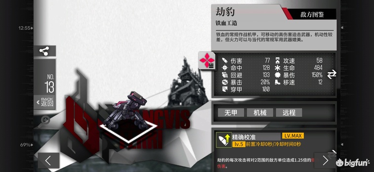 A+级4费aoe狙,635的1半径范围dps,180中穿甲12高移速,2630等效血量。1半径范围普通攻击可暴击,可被闪避,计算护甲,计算自身不计算敌方编制。当命中两组敌人时1270dps略高于猎欧1195,命中2组119甲白高达时957dps,命中绿无敌时会抛光。攻击非高甲高闪敌人时,命中2组小于100甲时dps高于猎欧,命中3组时dps始终高于猎欧。铁血中唯一的范围伤害狙,但是相比1.83的榴弹半径,劫豹1的半径致使其命中两组敌人并不稳定,且不能打高甲也是明显的致命缺陷。仅在密集型兵海表现出色,且受到过于强势的强无敌和破坏者的压制,强度不低定位尴尬,暂时先练一个即可。
