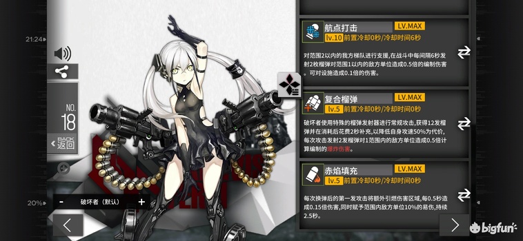 S级4费开场爆发输出,高穿甲低命中低移速,1076dps,1830开场5秒dps,2198等效血量。目前少有的高强度后排之一,开场爆发实用性强,低前摇高射速有效降低自身和队伍输出浪费,缺陷在于低命中和低移速。适用于低闪避所有局面,实战性强可迅速清兵补刀,但是可能会有未来的上位替代,练1-2个即可。