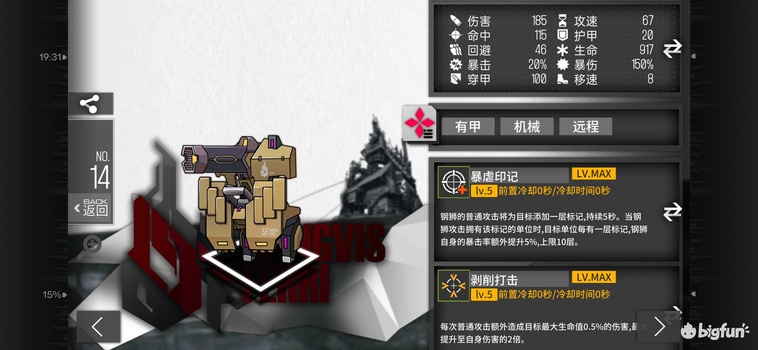 S+级6费单体持续防护狙,1323-4914dps,1639(白兵)-2568(白憨憨)一般dps,20护甲2323等效血量。对绿无敌(4w5血199甲)2077dps,对白憨憨(3w8血68甲)2568dps,对白兵(7500血0甲)1639dps,对7w4血无甲满4028dps,对1w4血无甲1778dps超过猎欧1.5倍的1765dps。一技能采用新的暴击加算机制,最高提升22%平a伤害,7.7秒叠满。上限很高下限不低,百分比血量伤害但有100穿甲制衡,面对高强度敌人相比猎欧有输出优势。装甲可降低打奎乌和正前方无T位时的战损,并让6钢狮特化队成为可能。2个钢狮和1个猎欧可降低鞭尸风险,适用于所有场景,基本是猎欧上位,有能力的养2-4个。