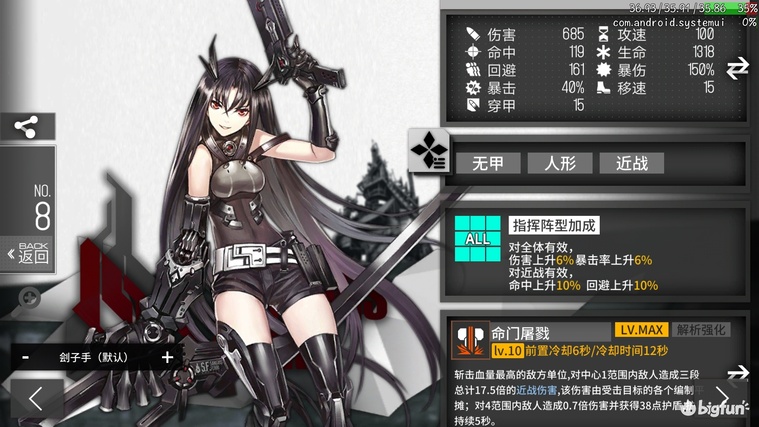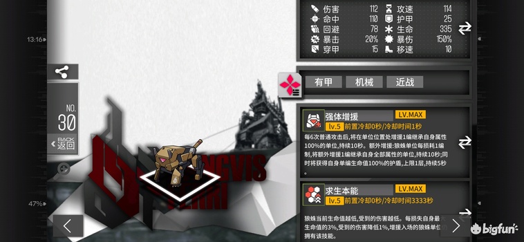 B+级近战叠伤刺客,20移速180穿甲,694- 1136dps,3656-8124等效血量。1技能每4秒一层36削甲,最多12秒108削甲。2技能0.89秒叠满1136dps,1.80秒叠满8124等效血量。最高输出相当于猎鸥,最高等效血量相当于boss。但目前并不需要输出扛伤,近战叠层数导致输出不灵活,无盾无甲又会增加战损。当前的拉枪削甲工具人,定位特殊但强度并不顶尖,练一个备用。
