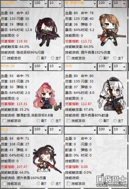 技能输出:WA2000的技能比较吃环境和阵容所以不太好讨论。技能输出的话分两种,分别是技能提升类和炮狙两类。技能输出的话由于时间不同,所以整体不太好区分,但考虑伤害型技能瞬间的爆发能力比较高,整体上还是比攻速型小优。英皇高于m14高于SVD,但是让SVD打满8秒的话,可能会比两者略高一些。炮狙方面依次是NTW-20、德皇、南半球、PSG-1以及SV-98,当然PSG会略优一些。