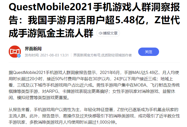 并且,在近两年的相关公布的数据中可以非常明显看到,PC端网络游戏的玩家群体逐步转变到移动端,甚至手游的玩家群体人数已经超过PC端的玩家群体人数。可见,手机游戏接下来仍为玩家们主要聚焦的方向。