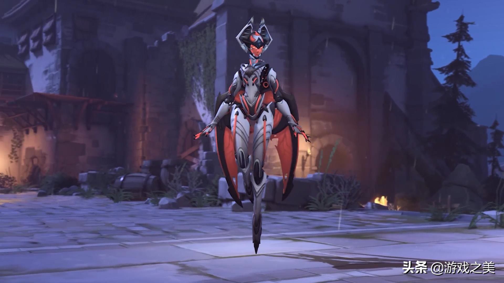 吸血鬼蝙蝠套装Echo具有令人毛骨悚然的未来主义的白色、黑色和红色的美感,她的翅膀形状像蝙蝠的翅膀,使套装更加完整。她的头部有蝙蝠般的耳朵,她的 "脸 "在蝙蝠张开的嘴里。