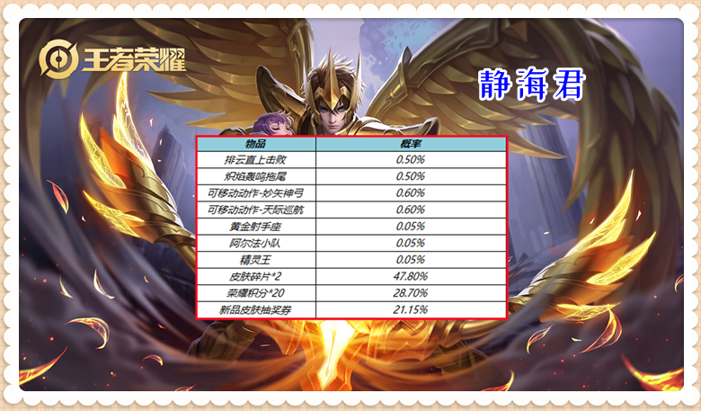 在英雄碎片部分有十分热门的小乔、后羿、瑶、东皇太一、老夫子;在皮肤碎片部分有电玩小子(鲁班)、鬼剑武藏(宫本)、阿摩司公爵(鬼谷子)、红桃皇后(芈月)、天使之翼(孙膑)等强势或者被加强过的英雄。