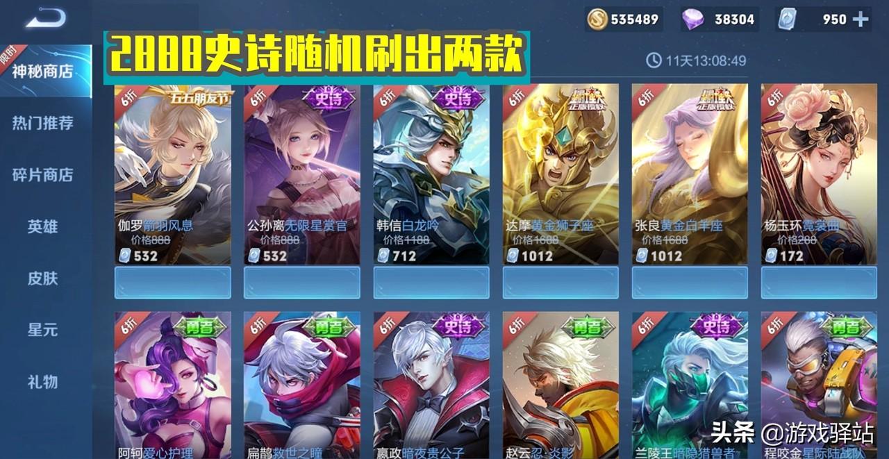 788、888和1188史诗方面,每位玩家的皮肤列表固定上架7款,系统依据玩家的拥有情况随机刷出,而这次可选皮肤合计有14款,分别是阿轲节奏热浪、伽罗箭羽风息、公孙离无限星赏官、韩信白龙吟、李白千年之狐、嬴政暗夜贵公子、兰陵王暗隐猎兽者、嬴政摇滚巨星、曹操幽灵船长、妲己女仆咖啡、吕布圣诞狂欢、小乔缤纷独角兽、李元芳逐浪之夏、刘邦德古拉伯爵。也就是说每位玩家的神秘商店会从14款史诗中随机选出7款,其中前六款史诗不会加入碎片商店,因此优先选择,剩余8款皆可消耗皮肤碎片换取。