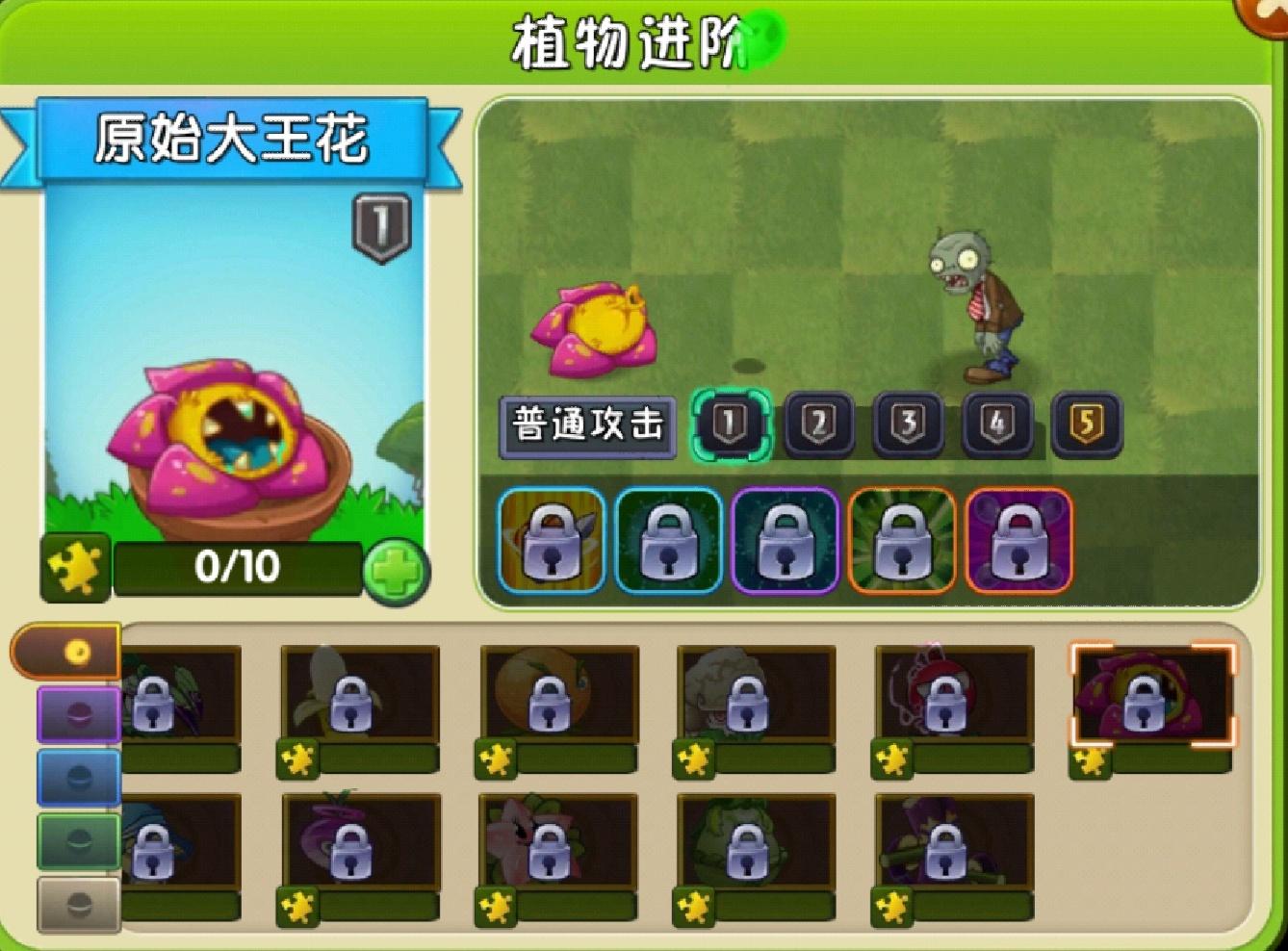 原始大王花,各项属性还算不错,但又没什么特别亮眼的,鸡肋一般的存在。更像是一个高配版树脂投手,可以在恐龙无尽打辅助,总体来说不建议花太多精力升级这个,除非闲得慌或者喜欢收藏。