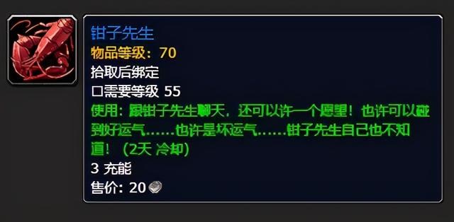 外域渔翁的至高奖励当然就是上面这个“钳子先生”,物品描述中写到,你可以向钳子先生许愿,然后实现三个愿望,看上去噱头十足。
