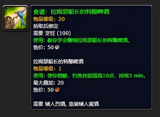 而其他几类任务的奖励袋则能开出一些杂七杂八的小玩意儿。其中比较有价值的是一份特殊食谱——“拉姆瑟船长的特酿啤酒”,饮用后会使你微醉,并获得钓鱼技能提升。