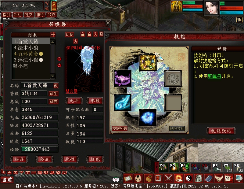 新手玩家注意,聚魄丹、技能书、龙骨龙魄打在可交易宝宝上宝宝变成禁交易,美誉宝匣兑换的召唤兽经验也会让宝宝变成禁交易。给宝宝打技能,技能总会顶去,还是花点通宝锁定一下重要技能比较划算。同时注意,召唤兽炼兽时,副召唤兽的技能也会被随机顶替,而且天生技能不能转移,所以,没有用的普通技能在炼兽时一定要该删就删。