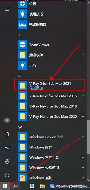 打开电脑左下角的开始菜单,找到V-Rray 5 for 3ds Max2021文件夹,点击展开。
