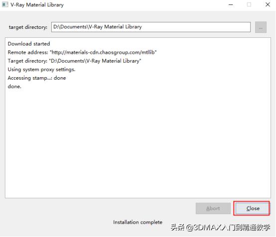 点击ABORT DOWNLOAD,因为在线安装材质库,如果出现安装失败的情况,所以提前下载好了材质库,在安装包里面,这一步直接跳过就可以了。