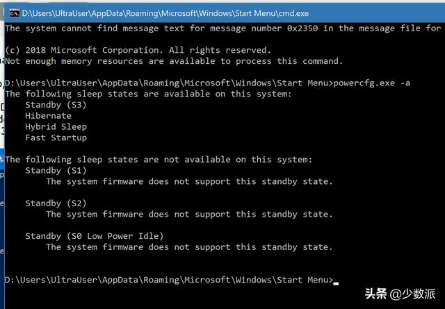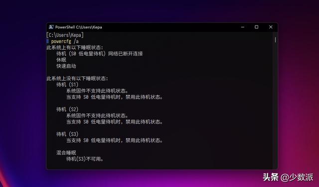 所以,新型待机对 PC 上的芯片组等设备有一定的要求。以管理员权限运行终端命令 powercfg /a,若结果含有 Standby(S0 low power idle),则说明你的设备为新型待机。使用新型待机的设备,不支持 S1-S3 睡眠模式: