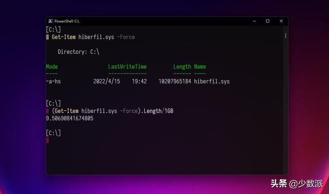 但微软的考量是,S4 休眠生成的文件比较大,Windows 上为可以使用总内存的 40%,我们能用 PowerShell 在 C 盘根目录看到这个休眠文件: