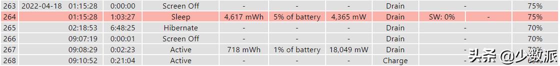 当然为了进一步增强 S0ix 的省电效果,新型待机还有一个机制叫做 自适应休眠:当新型待机期间耗电量超过 5%,系统会直接进入最深一级的 S0i5 状态,这个状态理论上功耗为 0 瓦。有这个机制的存在,有时候将笔记本合盖后,你会发现第二天再打开时就无法用键鼠唤醒了。如下表所示,由于某些软件活动,我的笔记本待机耗电达到了 5%(264),接着,PC 就直接进入了休眠模式(265),电量停止消耗。