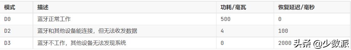 以低功耗蓝牙设备为例,不同电源状态下的功耗、恢复到正常状态的延迟和 Sx 状态类似,参考数据如下表所示: