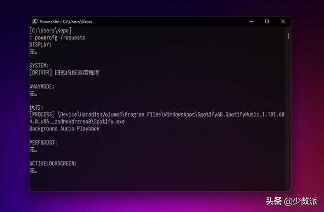 试想,我们正在观看一部 2 个小时的电影,PC 依旧死板地遵照设置,3 分钟无操作直接息屏睡眠,这样的体验实在很差。正是为了解决这些情况,应用可以发送电源请求,系统扫描到电源请求后不会发送切换状态的指令。电源请求可以使用 powercfg /requests 看到: