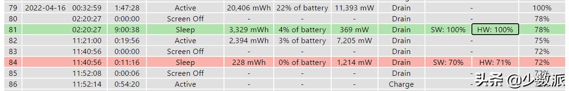 除了被激活器唤醒的小部分时间中,新型待机 PC 的功耗和 S3 相当。如下图所示,运行 powercfg /spr 生成的电池报表显示,在 2022 年 4 月 16 日 2 - 11 时的新型待机过程中,软件(SW)、硬件(HW)100% 处于低功耗状态,笔记本电量消耗了 3%:
