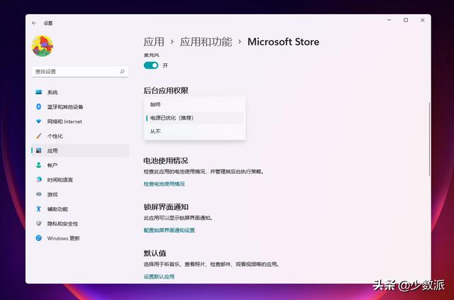 以 UWP 后台任务为例,我们在 Windows 设置中的应用 > 应用和功能 > 设置中看到一项后台应用权限,这个权限控制的就是在待机时,应用执行后台任务的能力。默认的「电源已优化」选项意思是根据 PC 连接电源的情况,决定是否执行任务。