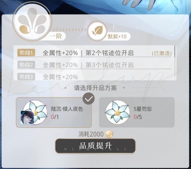 相当于升阶,需要用到相同的灵犀或者5星的勿忘,前期玩家可以暂时不用太过于考虑这个品阶,可以根据自己的运气,抽到哪个灵犀多就优先培养哪个灵犀即可,养成类游戏就是要长时间的培养。一共可以提升到五阶,可以激活属性加成和铭迹位。如果经济允许,这个对于灵犀的提升非常大。