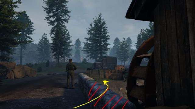 在这个场景中,你的任务乘坐降落伞来到森林中的检查点,偷一些制服和车。起初,Kim想要给玩家更多控制降落伞的自由,不过为了还原二战时期降落伞的特性,只能打消这个念头。当你降落后,会有中士来帮你一起消灭陆地上的敌人,并为你提供小刀来割断降落伞。如果你不用小刀割断降落伞,中士就会开始讲话,就像在真实生活中与人互动的感觉,不会陷入无声的尴尬。
