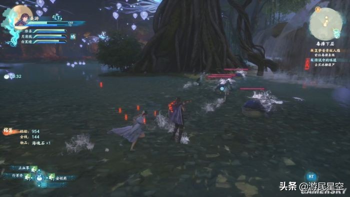 曾出现在《仙剑二》的御灵系统,也于本作迎来了回归。随着主线推进,女主可以收服不同御灵,并通过喂食灵果提升它们的等级,为全队提供增益。不过,只有选择出战的御灵才会激发效果,而未出战的御灵就完全无用,教学中对于这点的解说不够明确,让我在起初错用了“雨露均沾”的培养方式,对资源造成了浪费。