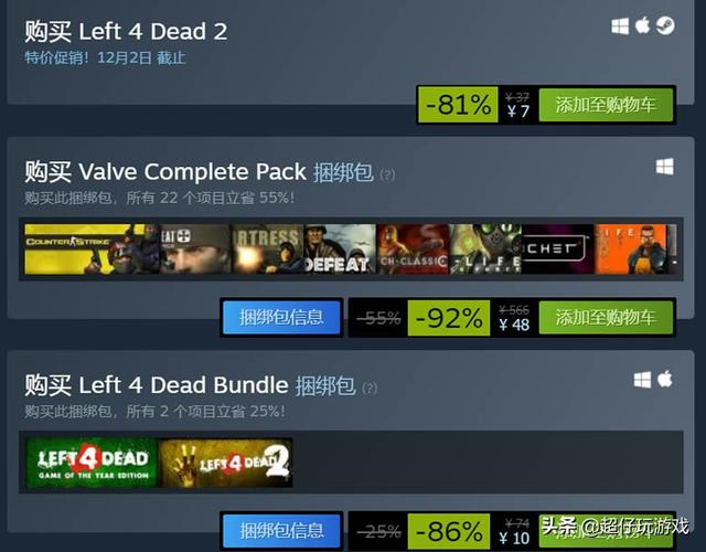 但《求生之路》两代耐玩度很高,即使没有通关过的情况下也是所有战役关卡全部开放可任意选择的。从今日西方感恩节开始,再度开启一周史低价促销: