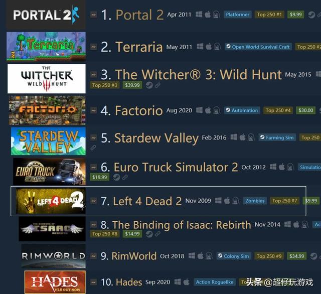 《求生之路》2代的4位主角形象以及战役地图更讨玩家喜欢一些,在Steam总排行榜上,《求生之路2》(Left 4 Dead 2)排行第7: