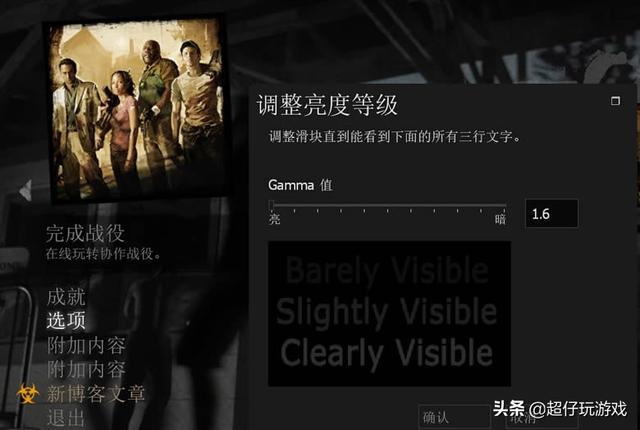 如果你是《求生之路》新手的话,超仔建议把选项里的“亮度”Gamma值调至左侧最高值即最亮,这样在充满火焰的楼道里、或者各种下水道黑暗处就不至于手电之外的屏幕画面黑到看不清了。